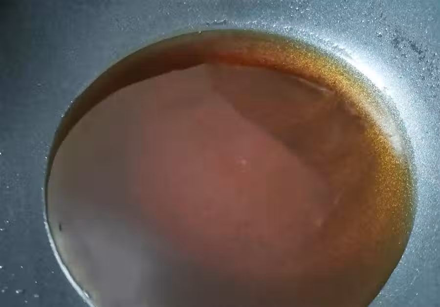 8.把鍋內油放置一會兒,倒出即可,這樣把油就洗好了,油沒有異味,也變得清澈了,可以炒菜用,或者炸制別的菜肴了。