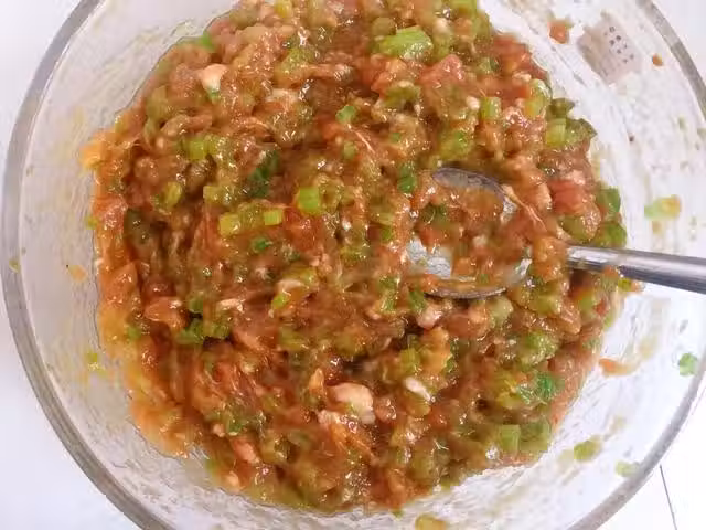 2.肉餡里打入一個雞蛋,倒入少許老抽,食鹽,十三香,蚝油,熱油。拌勻。然後加入芹菜,拌勻醒餡十分鐘即可。