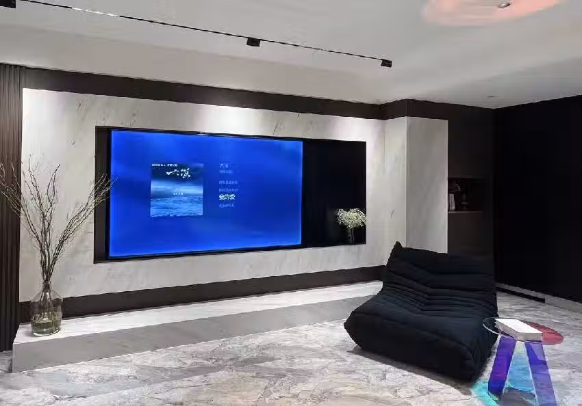 如果沙發和電視擺放位置有3.5-4米,且經濟條件允許的話,我是建議大家可以考慮85寸以上的電視,上牆後真的不顯大。
