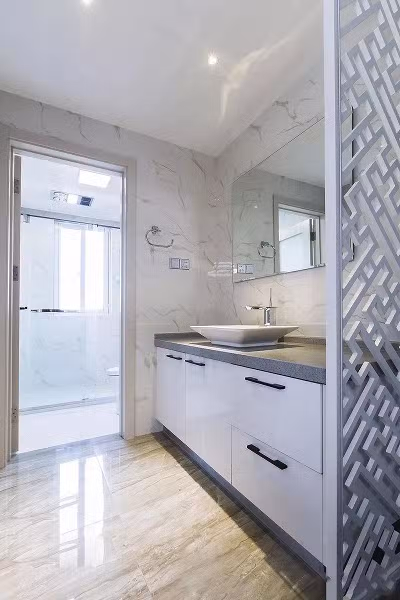 ▲一般洗手台外置的方式,通常洗手台一邊是要裝隔斷的,如果沒有牆壁的話。這樣的目的,也是將洗手台與其他區域隔開,使得相對獨立,而且顏值上也會大大提升。