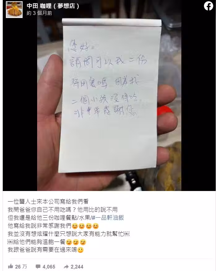 這則貼文發布後,立刻吸引16萬人按讚,網友們都為老闆的善舉感動不已,紛紛留言盛讚,「人間處處有溫暖」、「好人一生平安」、「我相信手心向上不得已,手心向下必得福份」、「不是炫耀,是在影響大家去幫助人」、「台灣人就是有人情味」、「好感人的故事」、「希望孩子們都能吃飽,爸爸也是」。