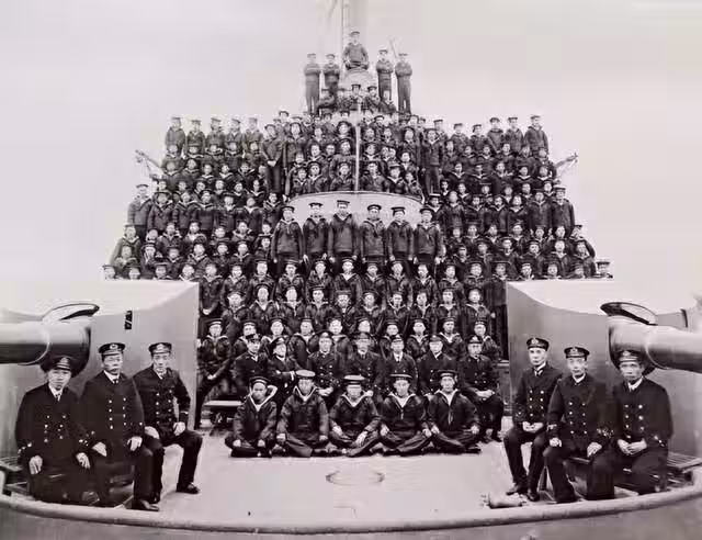 照片拍攝於1898年。這一年的2月,清朝向德國訂做了一艘裝甲巡洋艦,名為「海琛號巡洋艦」。7個月後,海琛號巡洋艦抵達天津,當時的直隸總督裕祿帶領驗收。驗收完畢後,直隸總督裕祿和巡洋艦的士兵們一起合影留念,可以看得出,照片里的士兵還是頗具新軍氣息,每一個都朝氣蓬勃,充滿精神。