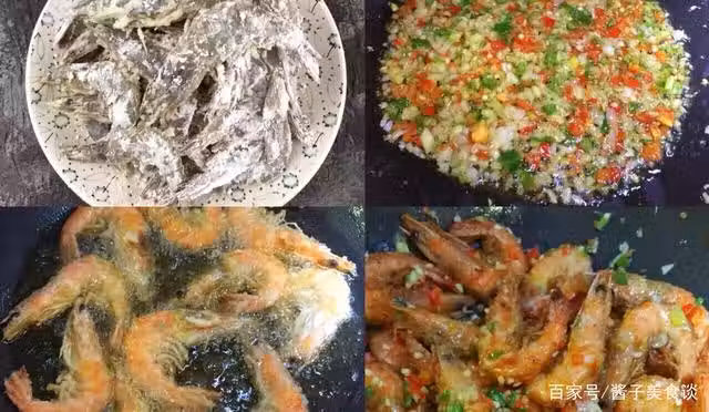 5、鍋內留少許油,加入姜蒜和青紅辣椒翻炒,炒出香味後加入炸好的蝦進去翻炒,撒點椒鹽粉翻炒均勻了以後就可以出鍋了。