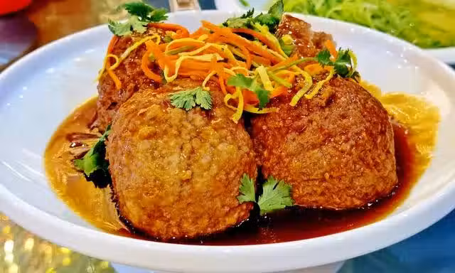 4. 熱鍋加油,加入八角炒香,再加入蚝油、開水、鹽、桂皮、香葉、白糖、老抽,煮開後加入炸好的丸子,大火煮開後,小火燉20分鐘後,大火收汁,將丸子取出裝盤,淋上少量的水澱粉熬製成濃稠的醬汁,澆在丸子上即可。
