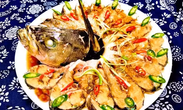 3. 在魚上重新放一些蔥絲、薑絲,撒上小米辣,先澆上蒸魚豉油,再澆上熱油,激發香味,即可食用。