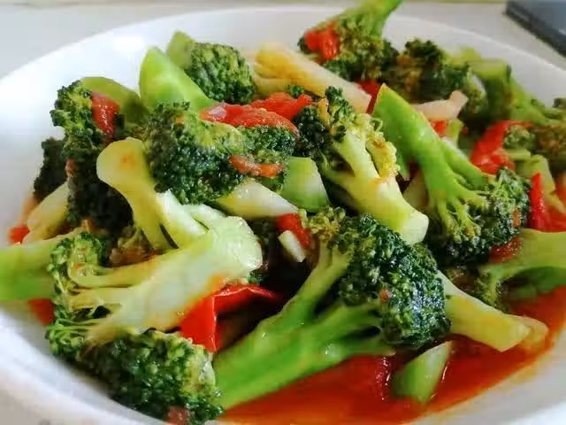 3、把焯好水的西藍花放入鍋中和西紅柿一起翻炒,翻炒均後加適量的鹽調下味,炒勻即可出鍋。