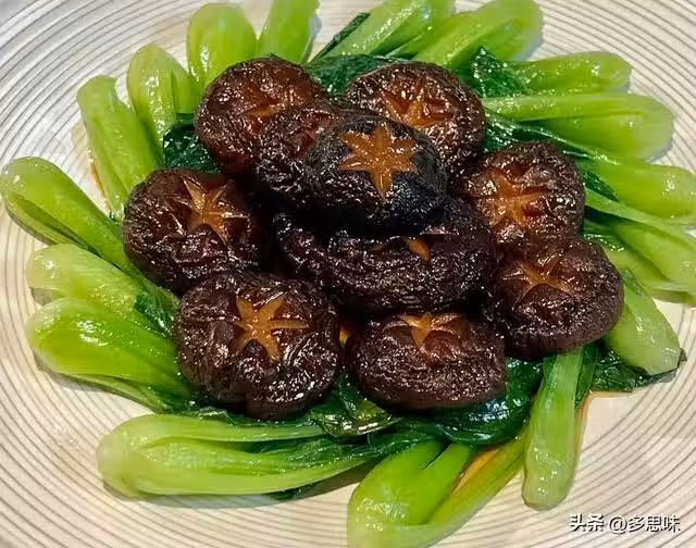 3、鍋中燒水加入食用油和鹽,先抓青菜的杆放入水中焯燙,然後全都放入水中燙一分鐘。取出把青菜擺盤加上香菇即可出鍋~