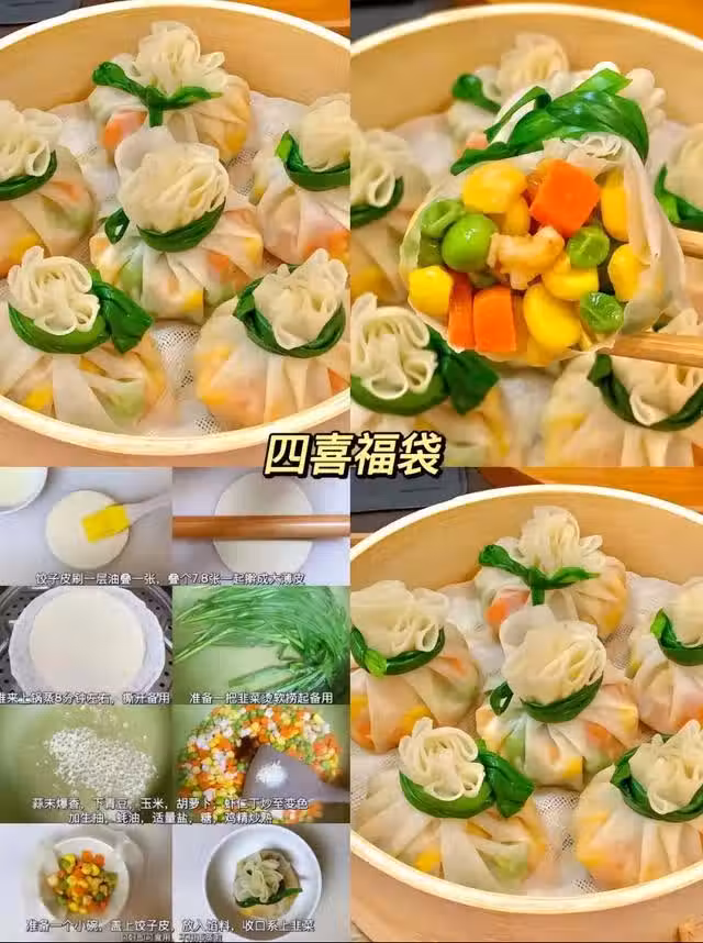 2.蒜末爆香,下青豆,玉米,胡蘿蔔,蝦仁丁炒至變色,加生抽,蚝油,適量鹽,糖,雞精炒熟,準備一個小碗,蓋上餃子皮,放入餡料,收口系上韭菜,包好即可食用,不用再蒸了。
