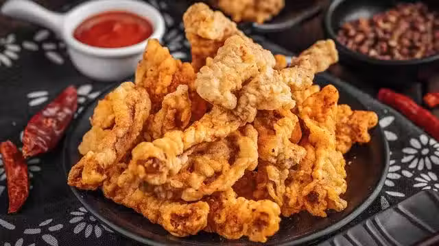 5.把鍋中油溫升至6~7成熱,把肉條重新放入鍋中,不停地翻動,復炸30~40秒鐘即可,撈出控油。