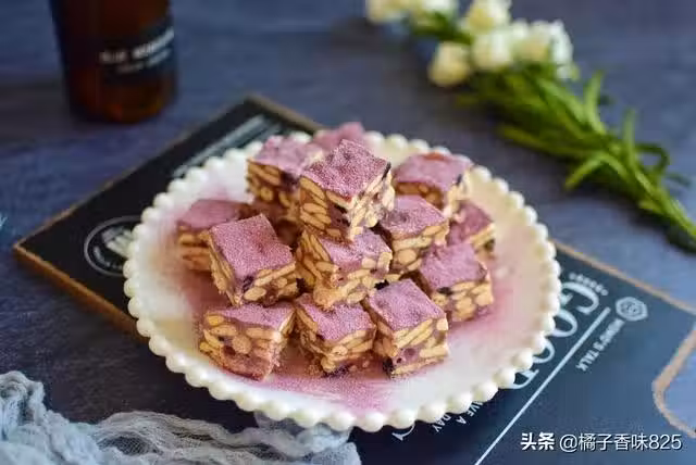 今天就來分享一道超級簡單,而且也是網紅美食雪花酥,大家看這個顏色,很多人應該沒吃過吧,是用紫薯粉做的,所以顏色有些發紫,顏值還是蠻高的!這裡除了添加了一些堅果和水果乾以外,還有不少的奶粉,所以吃上去有一股濃濃的奶香味,又香又甜,甜中還帶了些酸,甜而不膩,百吃不厭,給鄰居小孩嘗了嘗,一連吃了四五塊,還讓媽媽明天也給她做,紫薯雪花酥比牛軋糖還好吃,而且自己做料多超實惠,比買的健康多了,喜歡的朋友一定要試試這款紫薯味道的雪花酥哦!