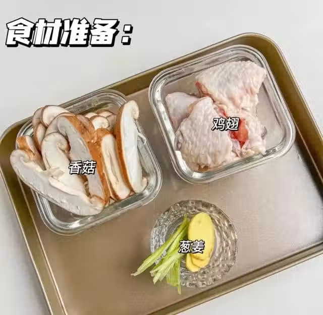 做法:放入蔥姜,醬油蚝油鹽,攪拌腌制入味,香菇鋪碗底,鋪上雞翅上鍋蒸40分鐘,出鍋撒上蔥花!………………………