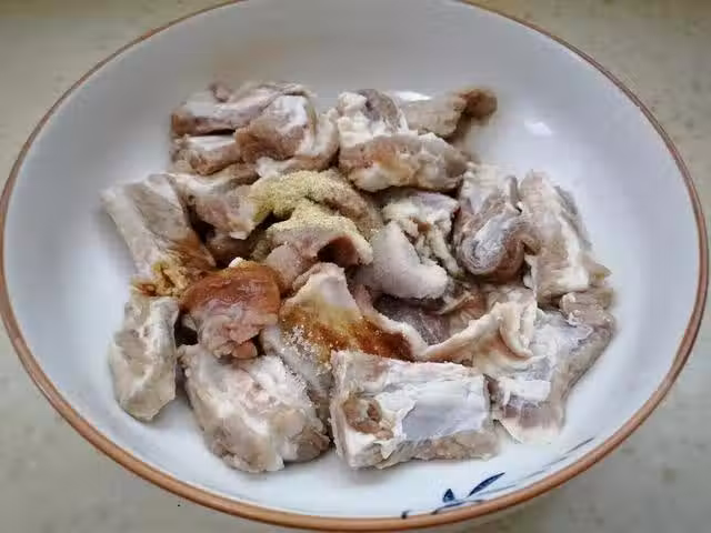 4、讓排骨裹上澱粉,再放入1勺食用油,攪拌均勻繼續腌制10分鐘。