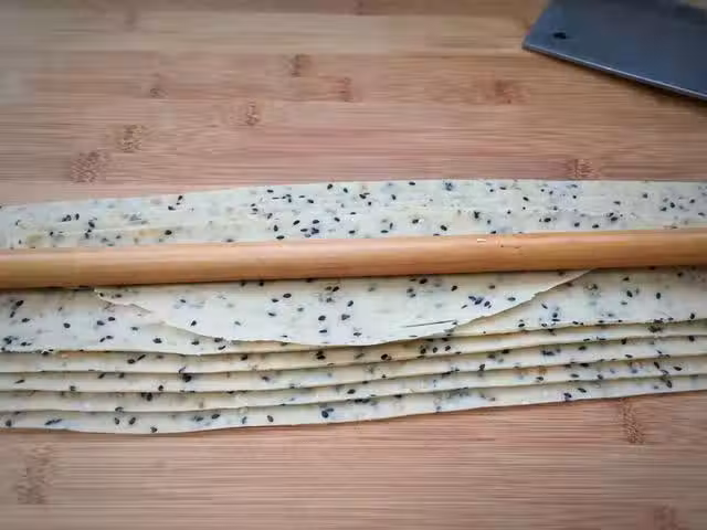 6、再把長面片切成長形小片即成麻葉子的生坯了,切完會有一些邊角料留著也要炸,中間用刀劃兩三下,兩頭不要切段,只切中間部分,中間一道長一些,旁邊兩道短一點。