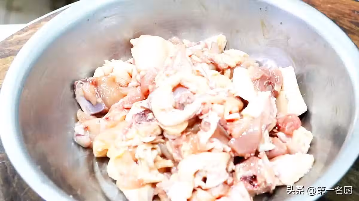 10分鐘過後,在雞肉裡面加入少許玉米澱粉,抓拌均勻,使雞塊均勻的裹上澱粉,鎖住雞肉裡面的水分,增加菜肴的口感。