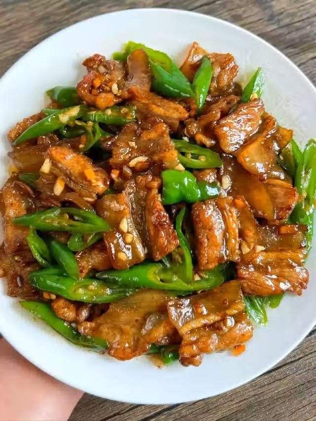 做法:鍋中不倒油,倒入五花肉炒出油脂,倒入蒜末爆香,放入辣椒炒出香味,1勺生抽,半勺老抽,1勺蚝油、少許鹽、少許白糖提鮮,翻炒幾下出鍋。