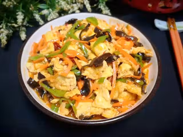 食材:雞蛋、木耳、胡蘿蔔、青椒、蔥、蒜、白糖、生抽、蚝油、陳醋、澱粉、豆瓣醬。