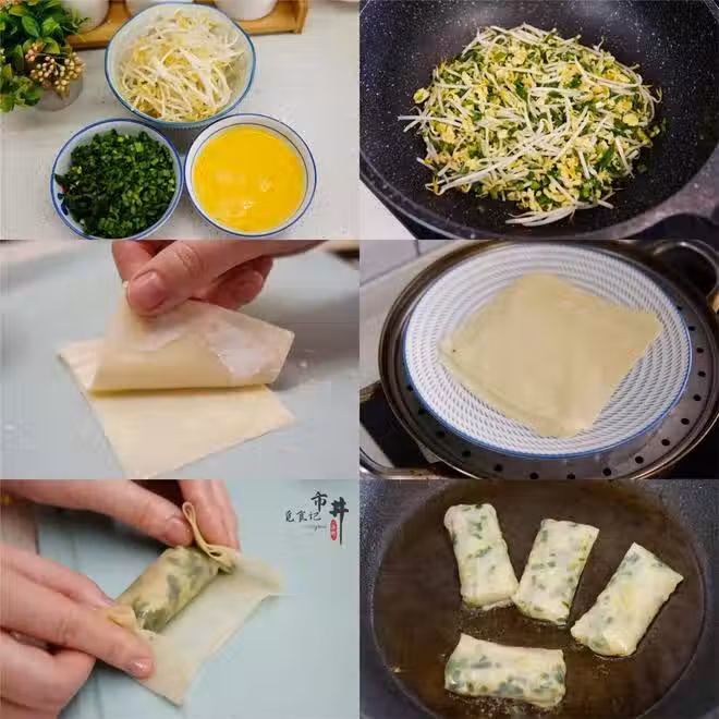 5、把餛飩皮放上蒸鍋里蒸五分鐘,取出揭開,放上餡料捲起來,將兩端收口折成長方形的春卷。