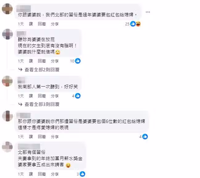 還有網友表示「南部哪時有這種無O習俗」、「我南部人第一次聽到,好好笑」、「南部習俗,過年要把媳婦趕出家門才對,順便丟個幾萬塊給媳婦叫媳婦去旁邊」、「以前古早時代,女人都沒上班,怎麼可能有年終獎金分3成的習俗,笑死」,除此之外,還有網友歪樓「有啊!可是要用燒的」、「南部習俗是拿出三成買金紙燒給問題很多的婆婆」、「還有一個習俗是過年要請孝女白琴幫婆婆慶祝」。