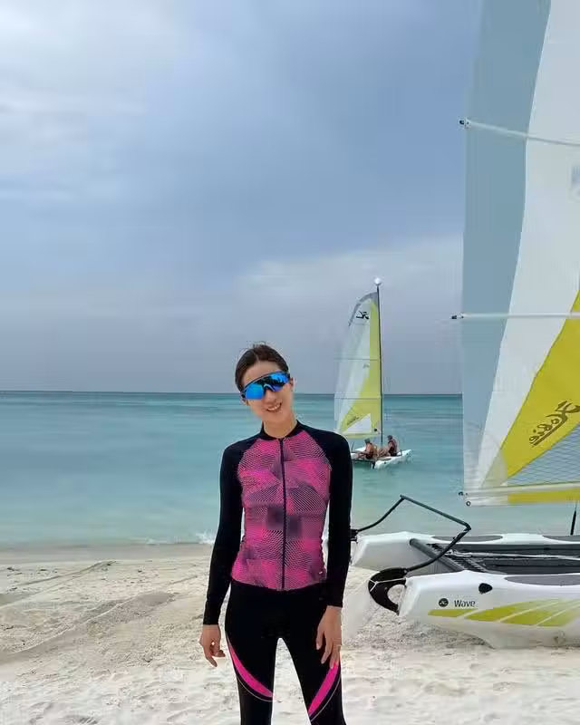 除了穿嚴實的防曬衣玩滑浪風帆外,其間鍾嘉欣又以一件弔帶曬玉背,照片中可見她一邊欣賞180度無敵海景、一邊嘆心形漂浮早餐(Floating breakfast),氣氛浪漫又寫意。