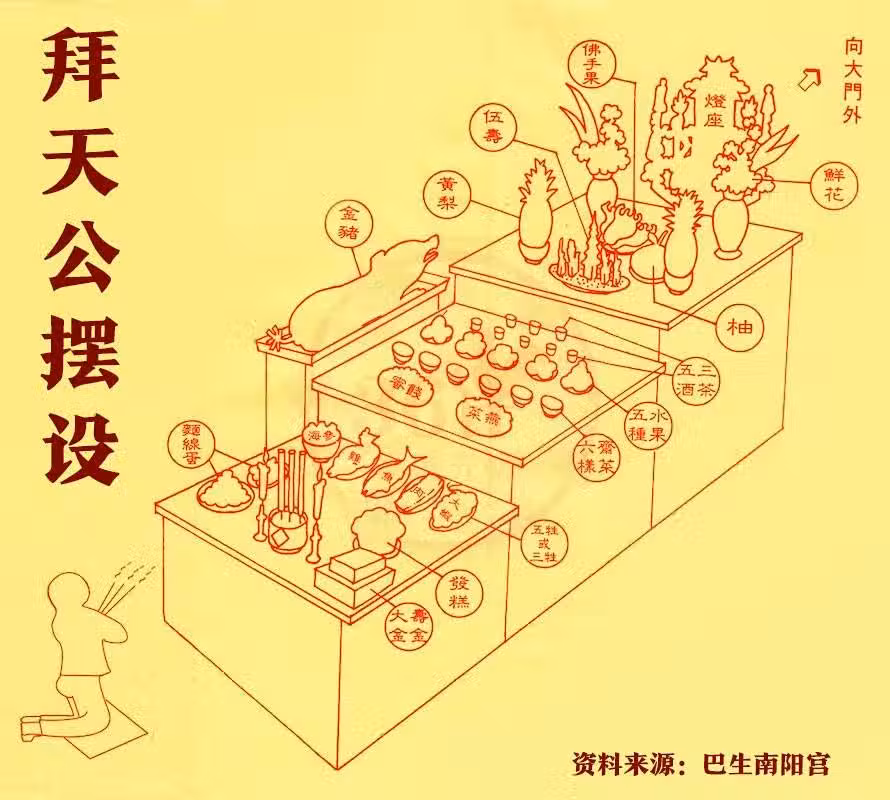 供桌以紅布圍上,甘蔗放在左右兩邊。供桌前中間放燈座,接下來擺放鮮花、黃梨等。接下來3茶、5酒、5果、6齋,最後擺放一隻雞、一條魚、大蝦、鴨、雞蛋、面線、發糕等。