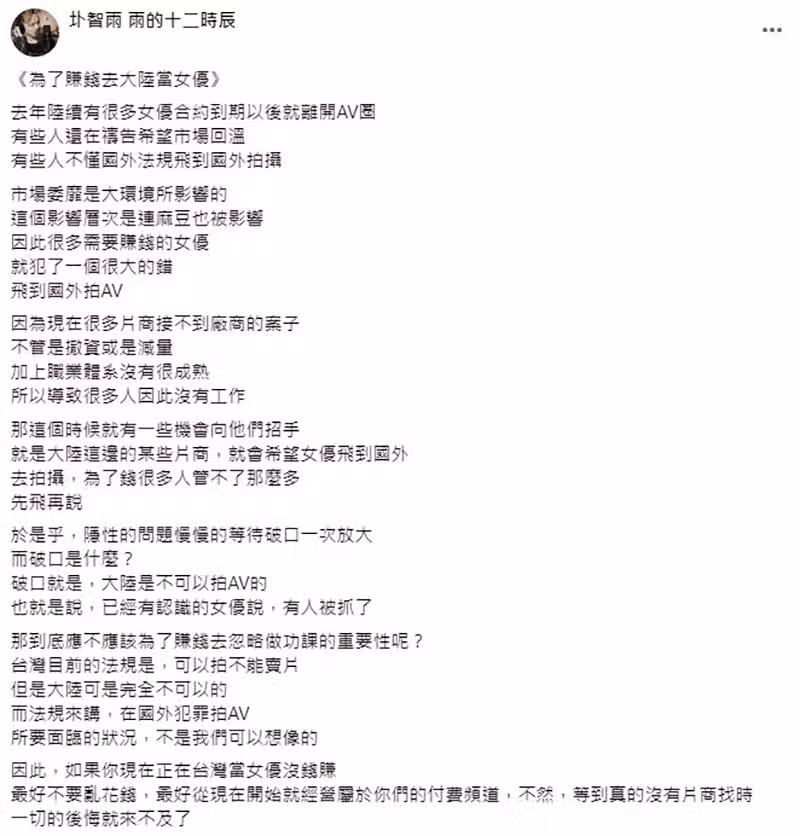 圤智雨指出,台灣目前的法規是可以拍攝AV但不能販賣,但大陸是完全不可以,拍了就是犯罪,然而有些台灣AV女優卻只想著賺錢而沒有做功課。他奉勸,台灣目前沒錢賺的AV女優,「最好不要亂花錢,最好從現在開始就經營屬於你們的付費頻道,不然,等到真的沒有片商找時,一切的後悔就來不及了。」