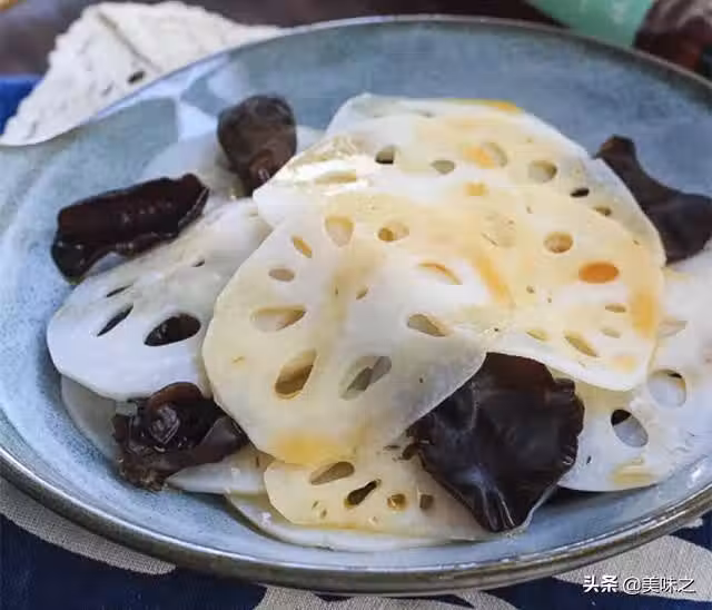 5、焯水後的蓮藕片、黑木耳擺放在盤子中,吃之前淋上柚子調味汁即可,拌勻後食用。