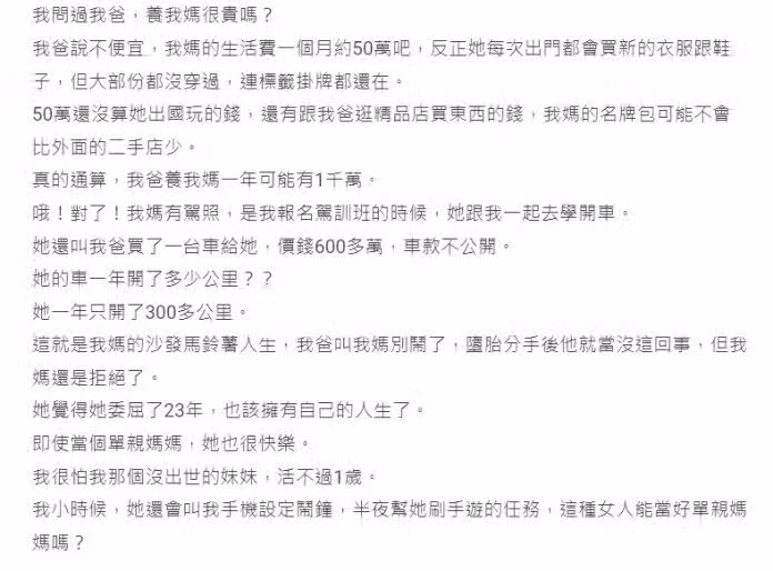 「沒算她出國玩的錢,還有跟我爸逛精品店買東西,真的通算,我爸養我媽一年可能有1千萬。