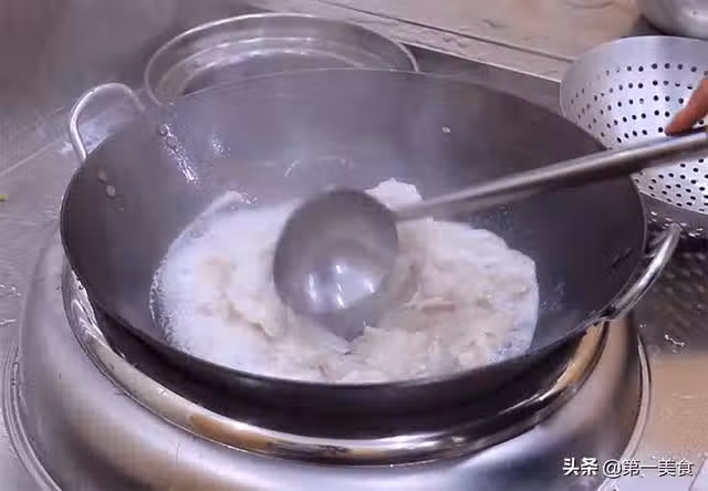 鍋內燒油,充分滑鍋以後,倒出熱油加入涼油,熱鍋涼油能防止炒肉片時粘鍋,把肉片倒入鍋中進行煸炒,充分煸出裡面的豬油,這樣吃起來不會膩口,肥油煸成透明狀態,還要再小火煸炒一會兒,大約煸炒3分鐘,肉片炒成微黃色時倒出來控油。