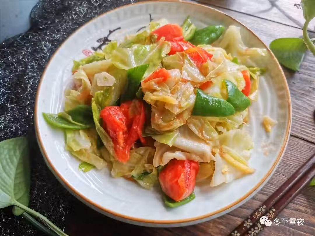 【包菜西紅柿炒尖椒】所需材料:包菜半顆、西紅柿2-3個、尖椒2個、油鹽適量、蔥1段、姜2片、大蒜2瓣、花椒適量、