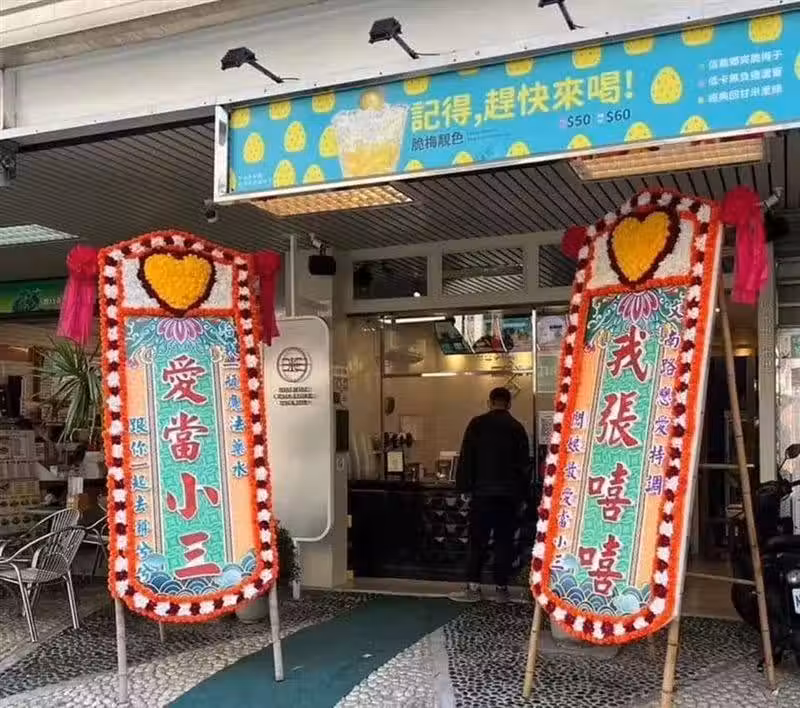 該文寫上「最狠的報復」5字,而照片中則可看到巨幅花牌就這樣放在手搖飲店門口,上面寫著斗大8字「我張嘻嘻,愛當小三」,一旁則以小字進行註解,分別是「文南路戀愛特調,闆娘最愛當小三」、「給我一瓶魔法藥水,跟你一起去髒兮兮」。
