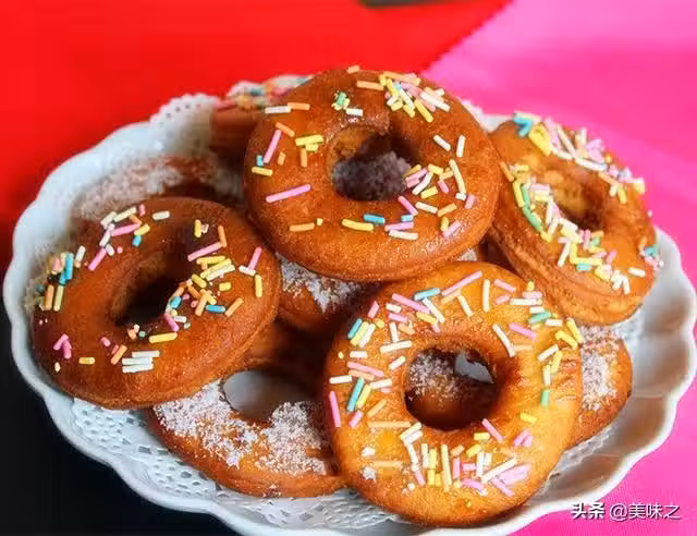 11、甜甜圈完全冷卻以後,在表面刷點蜂蜜水,粘點椰蓉,彩針或者糖粉作為裝飾。