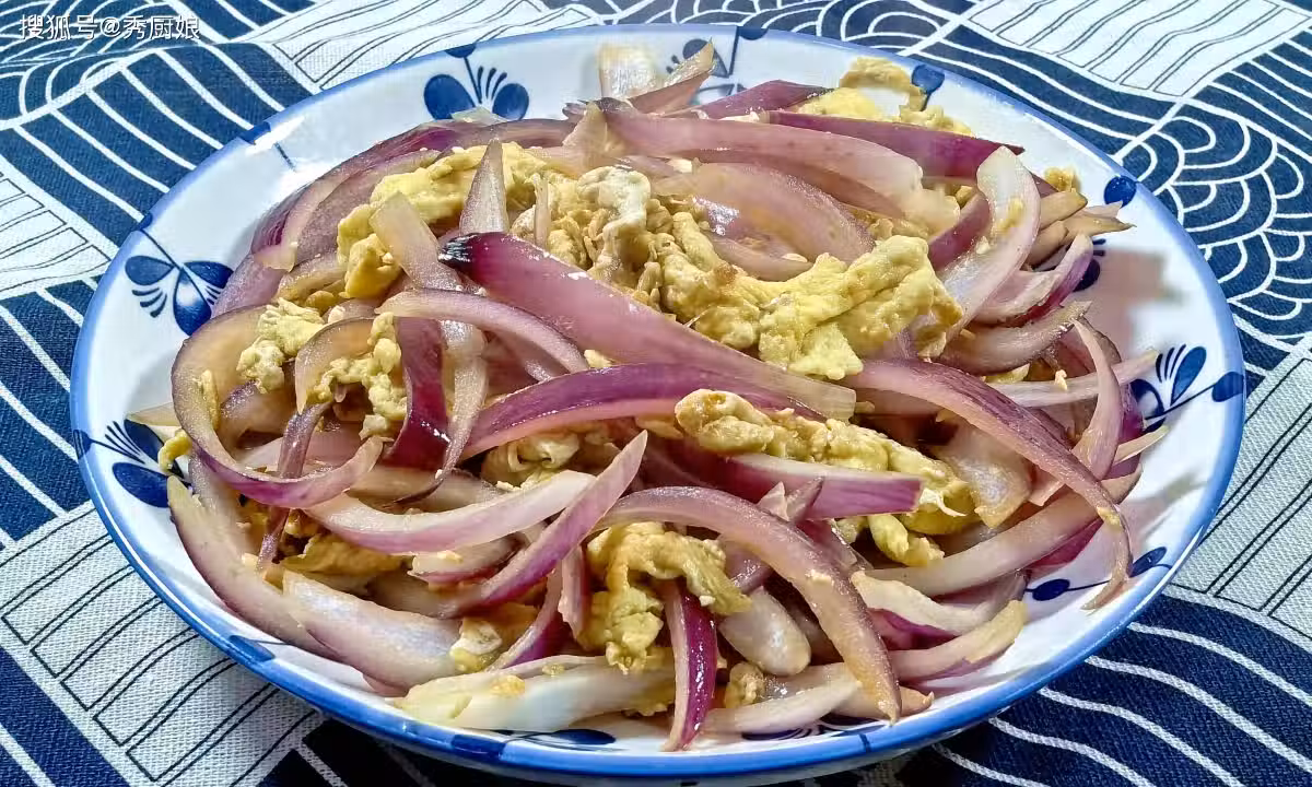 3. 鍋中加熱油,倒入打散的雞蛋,翻炒至雞蛋凝固後,放入洋蔥條,加少許鹽,炒至均勻即可。