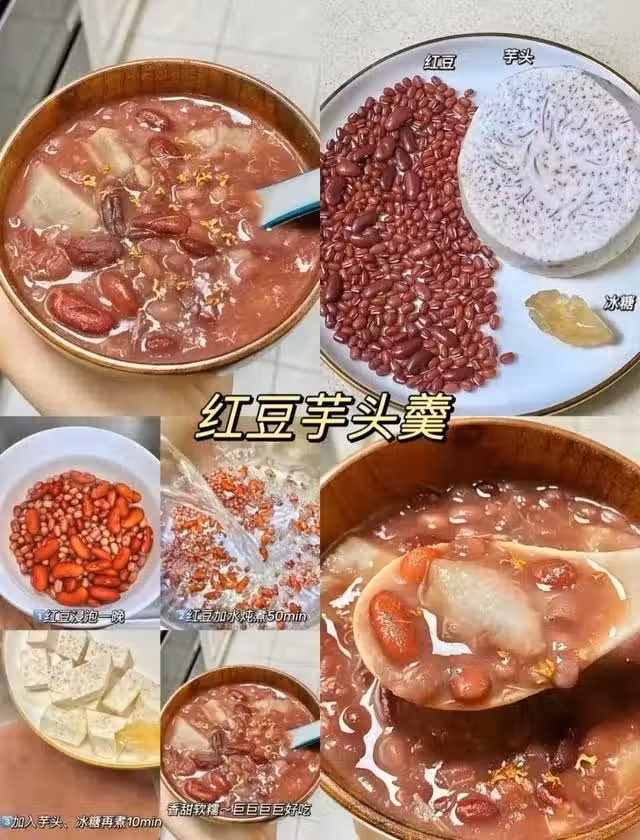 - 最後加入適量的冰糖,根據你的口味調整甜度,就可以享用美味的紅豆芋頭羹了。