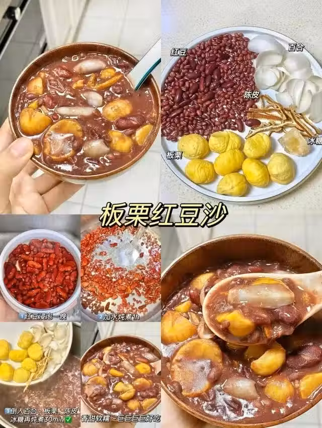 食材:紅豆、百合、陳皮、冰糖、板栗