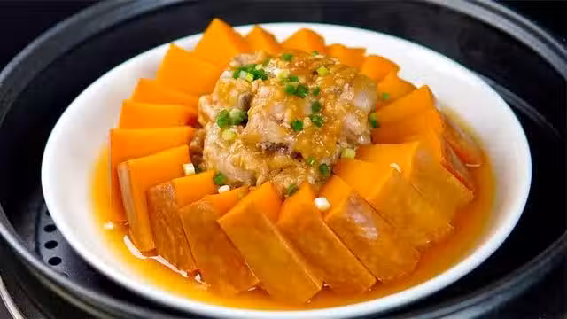 準備老南瓜中間位置,不用去皮洗凈去瓜瓤,切成比麻將大一點的塊,放到盤中碼成一個圓形,中間放上腌好的排骨,鍋里燒水,水開後上放入蒸鍋,蓋上蓋大火蒸20分鐘,蒸好後開蓋撒上蔥花