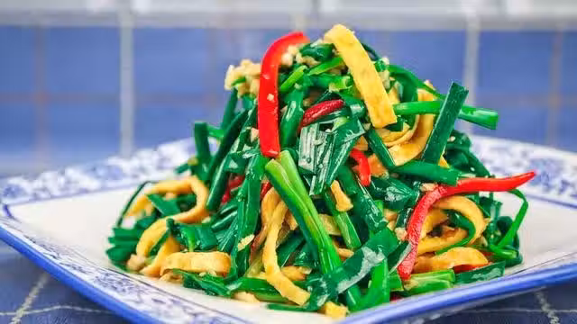 平底鍋刷油,倒入蛋液攤平,煎至兩面金黃色,煎好再切成條,跟韭菜放在一起,再放少許紅甜椒,顏色豐富也增加了風味。