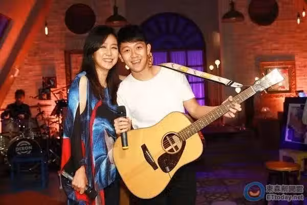 只見兒子Arthur,挺拔的身姿配上電吉他,頗有明星架式,私下的他已經是演出接不完的吉他手了,一點也不輸給媽媽,甚至於黃韻玲想找兒子一起搭檔,兒子還無奈回道:「你要提早跟我預定時間喔~」