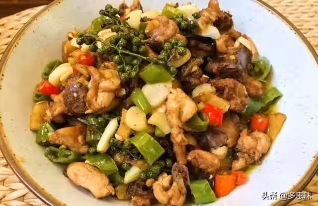 5:再熱鍋下油,油熱後將青椒小米辣蒜倒入鍋中翻炒,再倒入藤椒翻炒出香味,加入泡姜更入味,把炒好的雞肉倒入鍋中一起翻炒入味,炒到青椒斷生就可以了