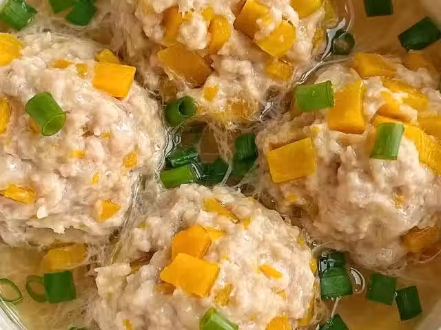 1、豬肉清洗乾淨切成小塊,再剁成肉末,加入南瓜丁、澱粉、食鹽和少許清水,攪拌均勻即可。