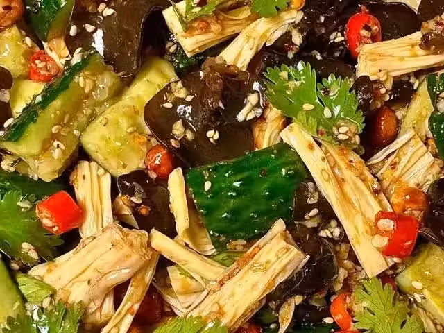 4、把炸過的花生米、黃瓜、腐竹和黑木耳放入碗中,倒入涼拌醬汁和香菜碎,攪拌均勻即可端上桌開吃。