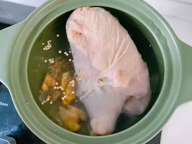 5、將準備好的砂鍋放在燃氣灶上,中小火燉煮,這樣慢慢燉煮能燉煮出其中的浮沫,撇掉表面的浮沫,能減少腥味,浮沫完全撇乾淨之後,蓋上蓋子,小火燉煮大約90分鐘。