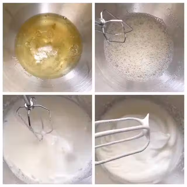 ④、蛋白打發好後,取三分之一的蛋白霜放入蛋糊中,用刮刀翻拌均勻,接下來再取三分之一的蛋白霜放入蛋糊中,按照上面的翻拌手法翻拌均勻,最後將拌好的麵糊倒入剩餘的蛋白霜中,同樣的手法翻拌均勻,這樣蛋糕糊就製作好了。——(①、蛋白霜與麵糊攪拌是蛋糕能不能發起來的關鍵,要使用炒菜方式翻拌或者Z字型手法翻拌都可以,千萬不要用打圈的方式翻拌,這樣蛋白霜的氣泡會被打破,從而影響蛋糕的膨脹。②、翻拌蛋白霜與麵糊要手法輕柔,慢慢地翻拌,不要粗暴有力,這樣也會影響蛋糕的膨脹。)
