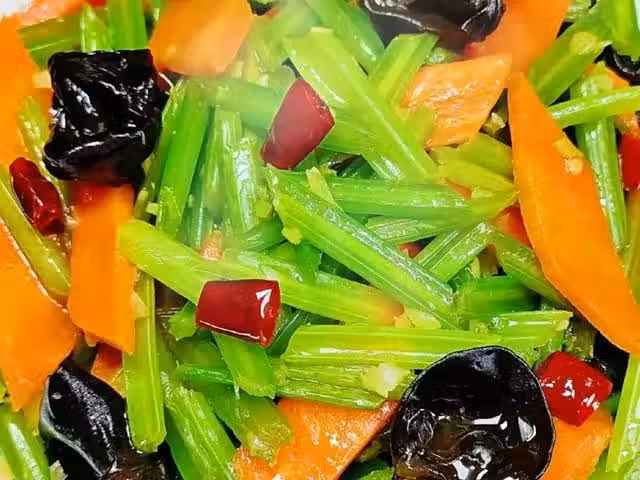3、起鍋燒油,油熱後放入蒜末和干辣椒炒香,再放入胡蘿蔔翻炒一會兒,炒至斷生後放入芹菜和黑木耳翻炒均勻。