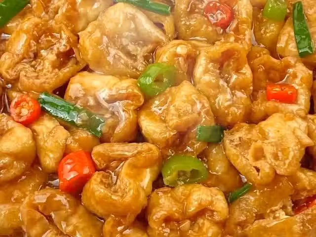 4、煮好後,放入青線椒和小米辣,淋入水澱粉勾芡,翻炒均勻炒熟即可出鍋開吃。