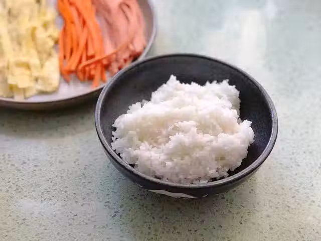 5、取一張海苔放在壽司簾上,將米飯均勻地鋪在上面,最上面的海苔預留出1厘米的空隙不要鋪米飯,然後依次放入蛋絲、胡蘿蔔絲、火腿絲以及黃瓜絲等,用壽司簾一點一點地將海苔捲起來,卷的時候稍稍用力按壓收緊,一邊按壓收緊一邊捲成紫菜卷,卷好以後用手稍稍箍緊確保海苔固定在一起,按照同樣的方法將剩餘的食材都做完就可以了。