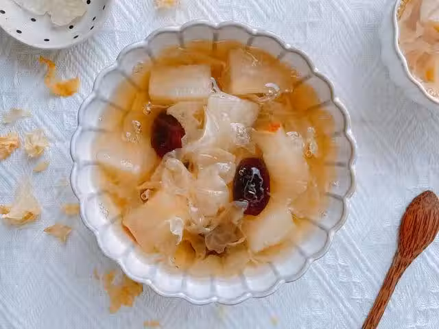 1、一小把銀耳、一個豐水梨(梨的品種根據喜好選擇)、幾顆紅棗、一點冰糖,這裡的份量夠一家四口人吃;