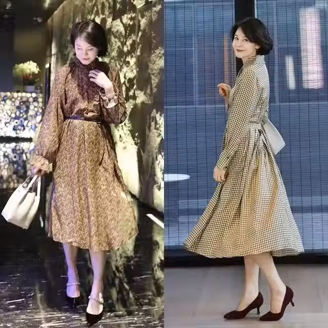 對於大腿有些發福的中年女人來說,「大波浪裙」是最適合我們身材的選擇。右圖穿的這款格紋「大波浪裙」款式設計精緻洋氣,大波浪的裙擺自然垂墜,寬鬆的廓形即使身材發福的中年女人也能夠完美駕馭。波浪的裙擺靈動俏麗,對中年女人的大腿部分具有很不錯的遮蓋作用,穿搭華貴又得體。