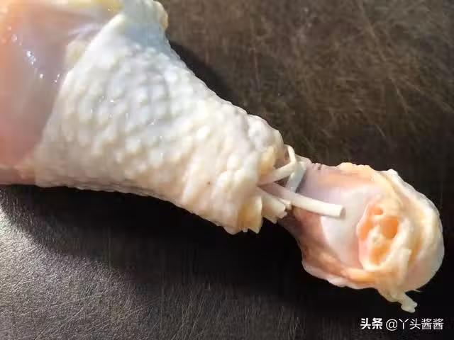 4、然後找到雞腿骨頭上肉比較薄的那一邊,然後用刀劃開,就能清楚的看到裡面的骨頭了。這個時候可以用手把肉掰開。
