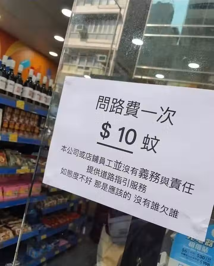 網友在臉書社團「爆廢公社公開版」分享一張照片,告示牌上方寫著:「 問路費一次$10蚊(約新台幣39元)。本公司或店鋪員工並沒有義務和責任,提供道路指引服務。如態度不好,那是應該的,沒有誰欠誰」超霸氣的告示,直接在網路上掀起論戰~