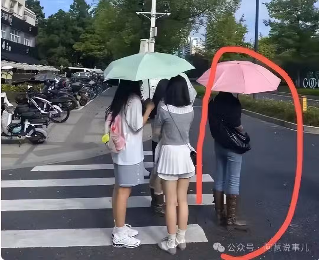 可其實仔細看一眼,就可以看出來幾名女生的家庭狀況,幾名女生穿著都是比較簡單的,但是仍然可以看出來,穿靴子的女生衣服都是名牌,帶著一把遮陽傘,一看就是家裡面受寵的「小公主」,家庭條件不錯。
